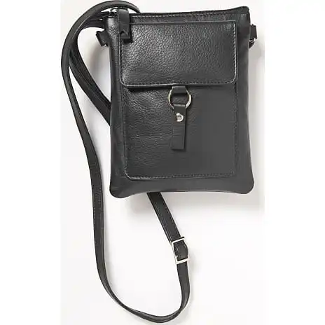Med skulderrem, metal ring på front og trykknap lomme. Lynlåslukning i toppen. Plads til kreditkort. Ekstra lynlåslomme på bagsiden.