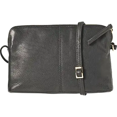 Crossbody taske med regulerbar rem. Lukket i top med guld lynlås. Frontlomme med guld lynlås. Indvendig lynlåslomme. 13 x 20 cm.