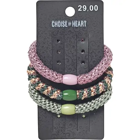Hårelastik uden metaldele, som kan virke skadende på håret. Elastikken er vævet og samlet med en lille perle.