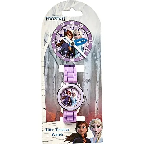 Lær-klokken ur med Frozen design. På viserne kan dit barn se, hvilken viser der er timer og hvilken viser der er minutter. Urværket er batterdrevet. Uret er i rustfrit stål og har silikone rem.