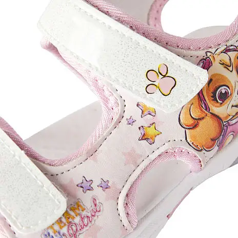 Paw Patrol børnesandaler med velcro lukning. Der er lys i sålen så den blinker når man går. Bemærk at batteriet ikke kan udskiftes og efter endt brug skal behandles som miljøfarligt affald.