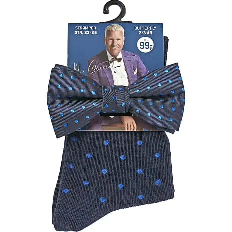 Mads Christensen børne sampak med en butterfly og et par strømper lavet i navy farve med blå prikker. Størrelse 31-34.