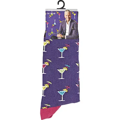 Smart bomuldstrømpe fra Mads Christensen. Lilla med drinks print.