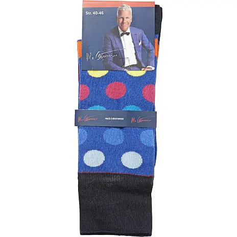 Mads Christensen bomuldsstrømper med prikker. Størrelse 40-46. Strømpen har højt skaft og elastik foroven.