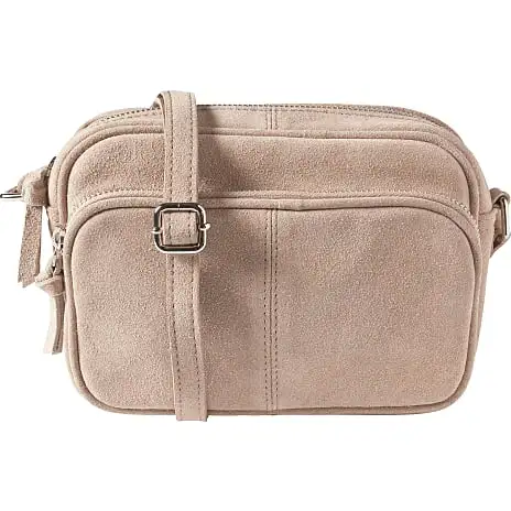 Crossbody taske med justerbar skulderrem og metallynlås i top. Frontlomme med metallynlås. Indvendigt lynlåslomme. 15 x 20 cm.