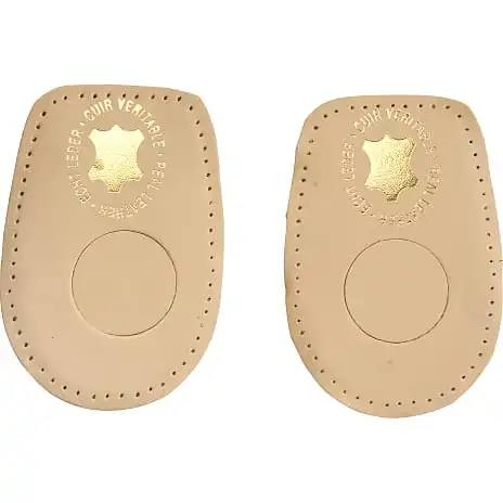 Hælsporekiler. Velegnet til aflastning af hælsporer. Forebygger ømme hæle og achillessener. Selvklæbende læderkile. De runde indlæg i kilen fjernes inden ibrugtagning.