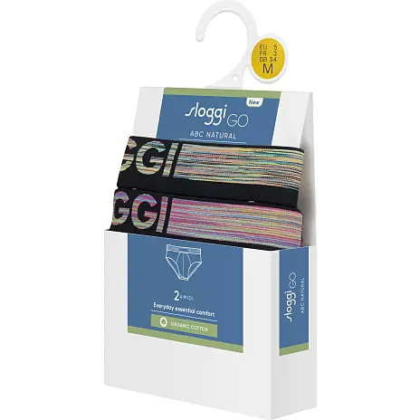 Sloggi GO ABC midi trusser. Trusserne har en bred flerfarvet elastik og en velsiddende pasfom som gør dem behagelige at have på. Indeholder 95% bomuld (økologisk).