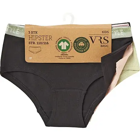 3-pak hipsters bestående af 3 ensfarvede med tekst på elastikken. Disse hipsters indeholder 95% bomuld (økologisk) og er GOTS certificeret. Findes i flere størrelser.