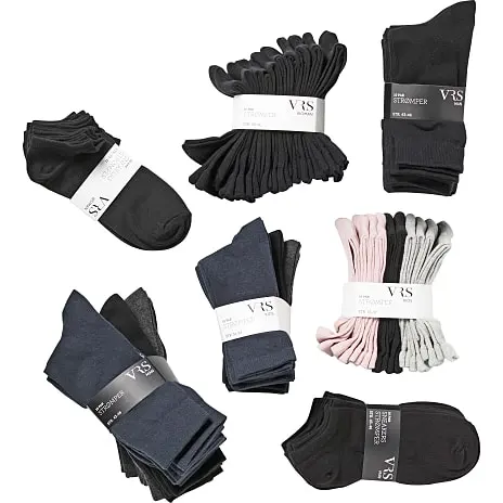 Strømper i finstrikket bomulskvalitet med ribkant og elastik foroven.
