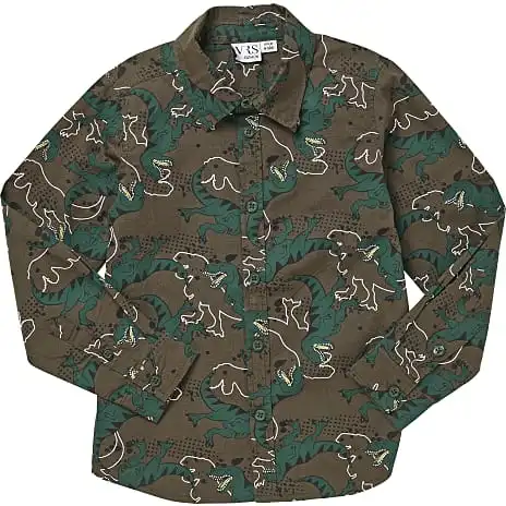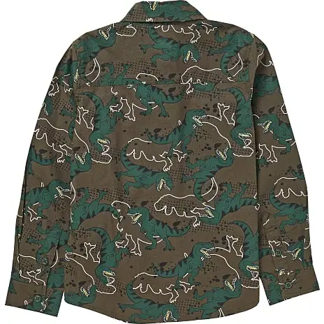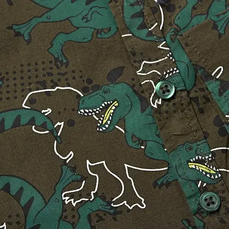Skjorte med dinosaur print til børn med krave og knaplukning. Skjorten indeholder 100% bomuld (økologisk). Findes i flere størrelser.