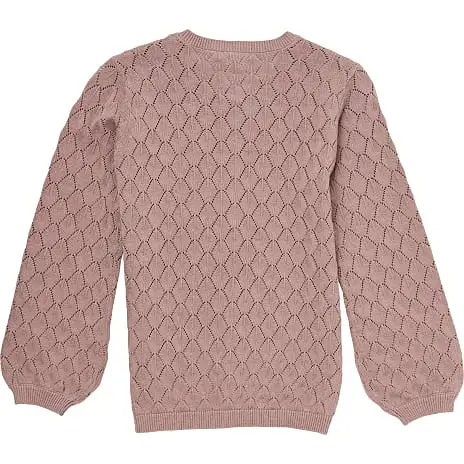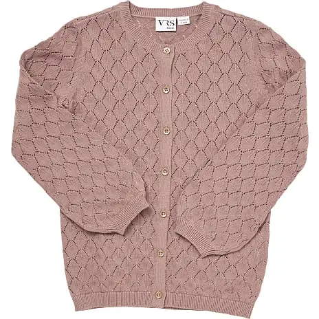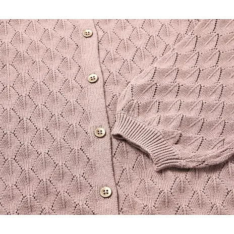 Strikcardigan til børn i rosa strikket i fint pointelle mønster og har knapper foran. Cardiganen indeholder 100% bomuld (økologisk). Findes i flere størrelser.