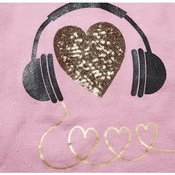 Kortærmet t-shirt til børn med print. T-shirten har høretelefoner i glimmer og et hjertte af pailletter