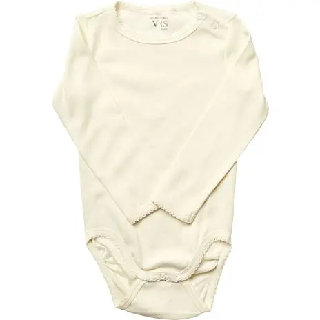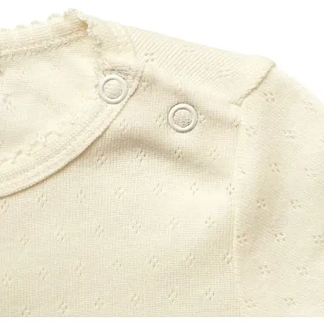 Langærmet body med hulmønster. Bodyen findes i flere størrelser. Denne body indeholder 100% bomuld (økologisk) og er GOTS certificeret