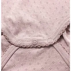 Langærmet body til baby i kvalitet med hulmønster. Bodyen har tarditionel knaplukning ved skulderen og benåbningen. Denne body indeholder 100% bomuld (økologisk) og er GOTS certificeret