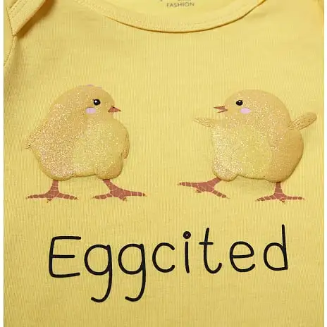 Body med lange ærmer og traditionel kanplukning ved skulder og benåbningen. Bodyen har påske print foran med glimmer.