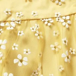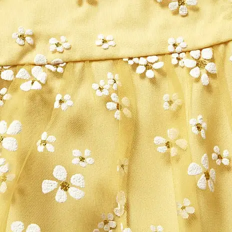 Kjole til baby med blomster og guld glimmer. Kjolen har knaplukning bag på, og fin flæse detalje ved ærmet.
