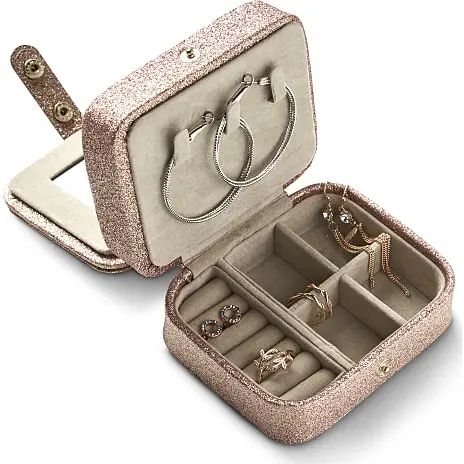 Et smart smykkeskrin med et spejl og inderside af velour. Smykkeskrinet er opdelt i to større rum med flere mindre rum i. Med dette smykkeskrin kan du opbevare dine smykker både hjemme og når du er ude at rejse. MÅL: 8,5 X 10,5 CM, HØJDE 5,5 CM
