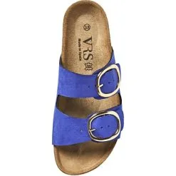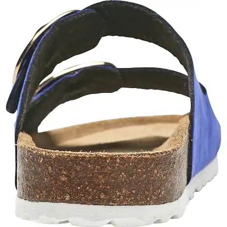 Bioslippers med to remme med justerbare spænder. Indersål i skind samt flot kant af kork.