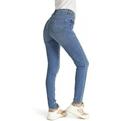 Basis denim jeans Freja. Buksen er i strækbar kvalitet, med høj talje, er tætsiddende og med smalle ben. Buksen indeholder 65% økologisk bomuld.