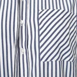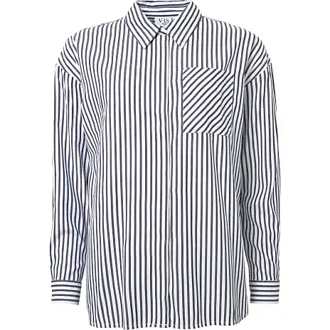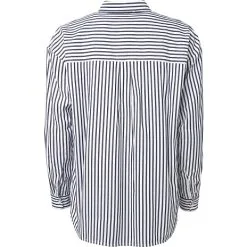Oversize skjorte i striber – som piftes op af glimmertråde. Skjorten har skjulte knapper foran pånær ved hals- og ærmeluk og er længere bagpå end foran.